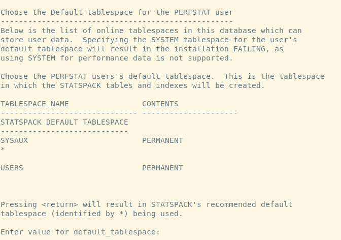 Luego solicitará los tablespaces para datos e índices donde se crearán las tablas de Statspack.